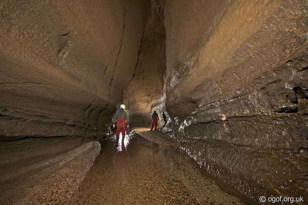 On exiting the Green Canal you find yourself at a junction with a huge passage leading off both ways. To the left is Trenchways, defined by the progressively deeper slot in the centre of the floor of the passage. This soon reaches The Abyss and the route to the Lower Series. To the right is Go Faster Passage which is large and lofty with clean washed rock and magnificent scallops in the walls of the passage. The passage gently meanders and often pools are found on some of the large corners. Eventually the passage changes character at a junction, with a sandy slope found on the left and a short climb up to a rift on the right. The sandy passage soon decreases in dimensions and can be followed for some distance until you are forced through a tight squeeze over a boulder to enter Surprise Chamber. There is no way on from Surprise Chamber. Back at the junction and climbing up on the right allows you access to a rift, this is Go Slower Passage. This passage is tall and narrows to slot in the floor that can easily be traversed over. The traverses soon become easier and the depth of slot decreases until you are in a cobble floored passage with standing water through much of it's length, which leads up to Rottenstone Avens.