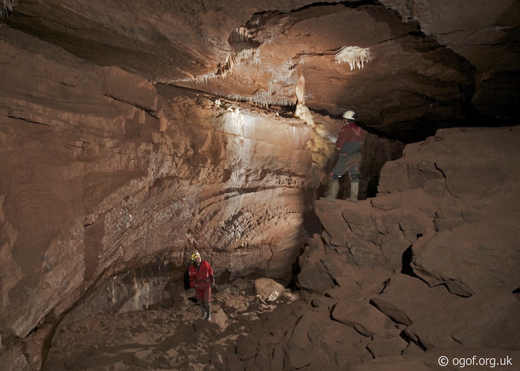 From the gated entrance a fixed ladder drops you down to the main passage, where to the right a descending passage takes you down to Gothic Sump. Ahead at the bottom of the ladder is the Cyril Powell Series, along sections of concrete footpaths in places, the remnants of an attempt to turn the cave into a showcave. On the left a shower inlet is passed at a junction, following this side passage leads over the top of Skeleton Chamber, where human remains were found by the original explorers, you can climb down into the chamber, but there is no way on. Passing over the top of Skeleton Chamber leads to Downey's Cave. Back at the junction the main passage continues past The Font, a calcite pool formation and then proceeds to a junction with a fixed ladder up to the Toast Rack, a passage on the right here leads across Pluto's Bath and down to the main streamway. Climbing the ladder takes you up to the Toast Rack, a series of fine gour pools, where a calcite flow can be climbed at the top to lead into Ogof Pant Canol. Following the main passage loops back towards the main streamway and a concrete balcony above the stream is followed to take you to an ascending passage with fine calcite floor. At the top of this passage is a junction, going up the calcite flow takes you to the Flood Escape Route, while following the bend the passage turns back on itself leading you down towards the streamway. A calcite flow on the left can be climbed to give access to Column Passage, with its fine calcite flows and large column. Continuing downwards to the sound of the streamway takes you to The Step, the general access point to the main streamway. Downstream will take you towards the sumps where the passage changes from a vadose canyon into low bedding passage before sumping. As you head downstream from The Step you pass a passage on the right that leads back to Pluto's Bath, a traditional exit out of the cave to ensure people get a thorough soaking. Heading upstream form The Step takes you along some of the finest stream passage in the country, with passage over deep pots in the stream made safer with scaffold bars to walk across. Passages on the left lead into the Railton Wilde Series, a set of passages that head away from the streamway and then loop back. These passages are well worth the detour as they contain some fine formations and dried gour pools. Back in the main streamway you continue until a junction is met, ahead water issues from a sump, while taking the passage to the left leads to Boulder Chamber, Lowe's Passage and the Waterfall Series. Following the main passage leads past Lowe's Passage on the right, with rope handline and then on a corner ahead on the right a climb up to the Waterfall Series. Continuing ahead leads to Boulder Chamber, where a large boulder choke is encountered. The route through is to the right care should be taken as over time the boulders are moving as the U shaped scaffold bar that you will see testifies! Once through the boulder choke a descending passage to the right leads down to Dip Sump, the way on is to the left to the connection with OFD 1 1/2. Back at the waterfall, a wet climb up or a traverse from further back up the passage leads into the start of the Waterfall Series. A choice of routes, the Wet Way and the Dry Way leads to a maze of interesting passages including a chimney up into Crystal Pool Chamber. Back at Lowe's Passage, a climb up assisted with the fixed rope starts the ascent into the upper series, but not before the passage drops to a crawl as you pop out at the bottom of a massive ramp of boulders. Height is gained quickly as you climb up the steep boulder slope until you approach the top of the passage. Here a climb up to a platform on the left leads to a series of bedding plane crawls and entry to Starlight Chamber. Back at the top of the passage the route continues ahead to lead you into Roundabout Chamber which boasts the Bees Knees calcite formations. A climb down through boulders leads some fine crystal walled passages before a bedding plane crawl - Roly Poly Passage is reached. Once through the bedding plane you enter the massive passages of the Rawl Series which ends in breakdown at Pi Chamber. From Pi Chamber a descent on the left leads to a discrete hole behind a rock that drops down a small and steeply descending polished passage to reach a traverse over a hole in the floor and the start of Bolt Traverse over the top of the main streamway. This 30m traverse assisted with the stainless steel cable takes you into a passage that leads to Rocky Holes Chamber, from here a passage to the left leads to a window over the main streamway - Airy Fairy traverse, but continuing to the right leads on to the Dug Out, a small squeeze into a large passage. The route is followed down hill over calcite covered floor and a few static pools until you reach the end of the Escape Route as you regain the main passage in the entrance series.