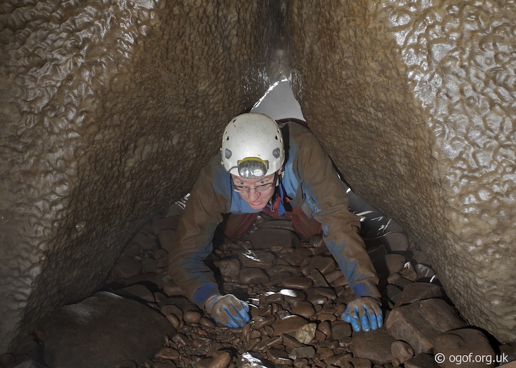 The way on is past the inlet, here the passage continues to meander with the roof height lowering until a hands and knees crawl leads to a mud filled choke at the end of the cave.